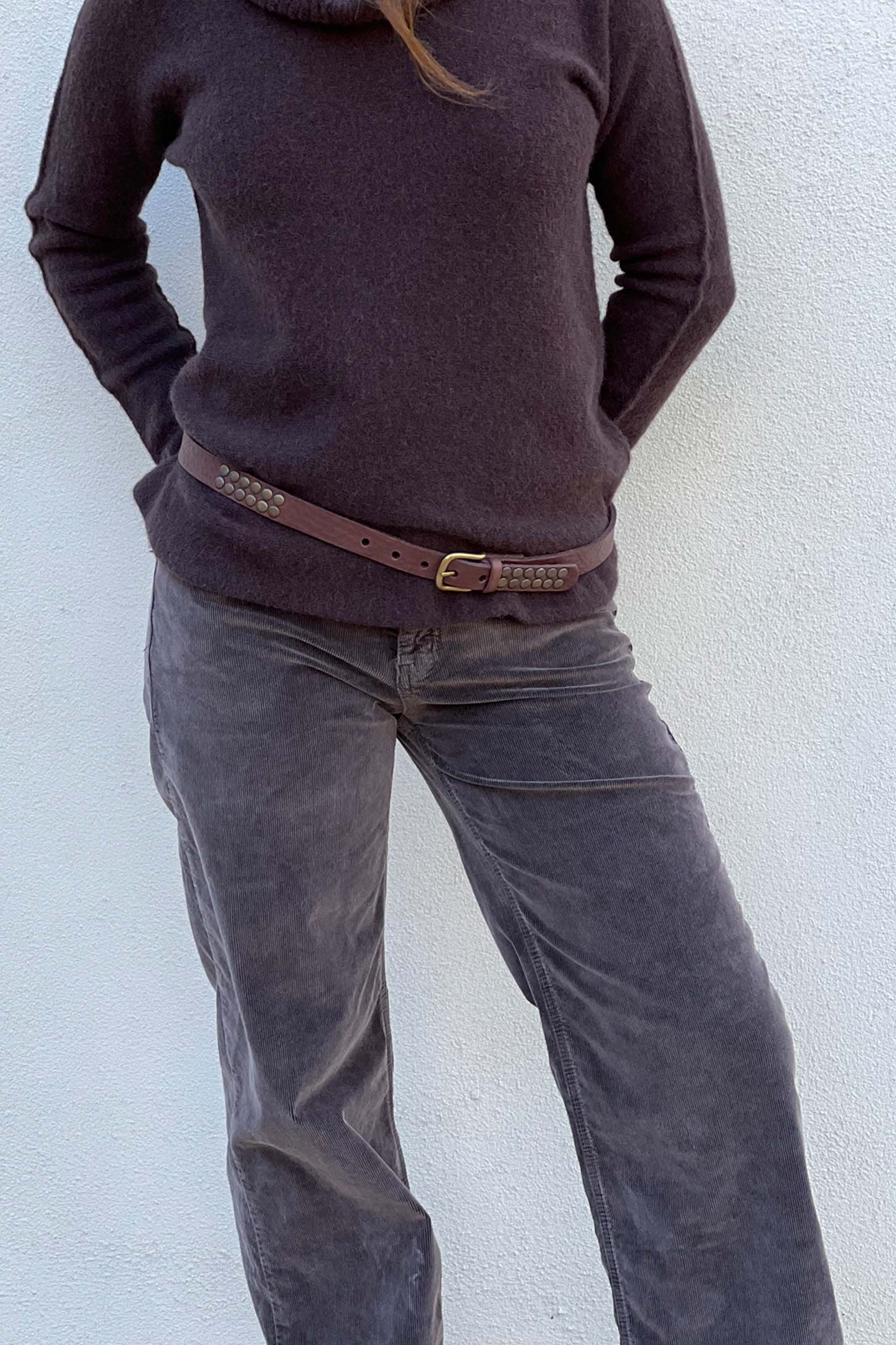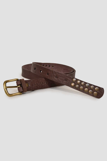 Cinturón de 2.5 cm de ancho confeccionado en piel. Hebilla metálica rectangular color oro viejo. Detalle aplicación de múltiples tachuelas.