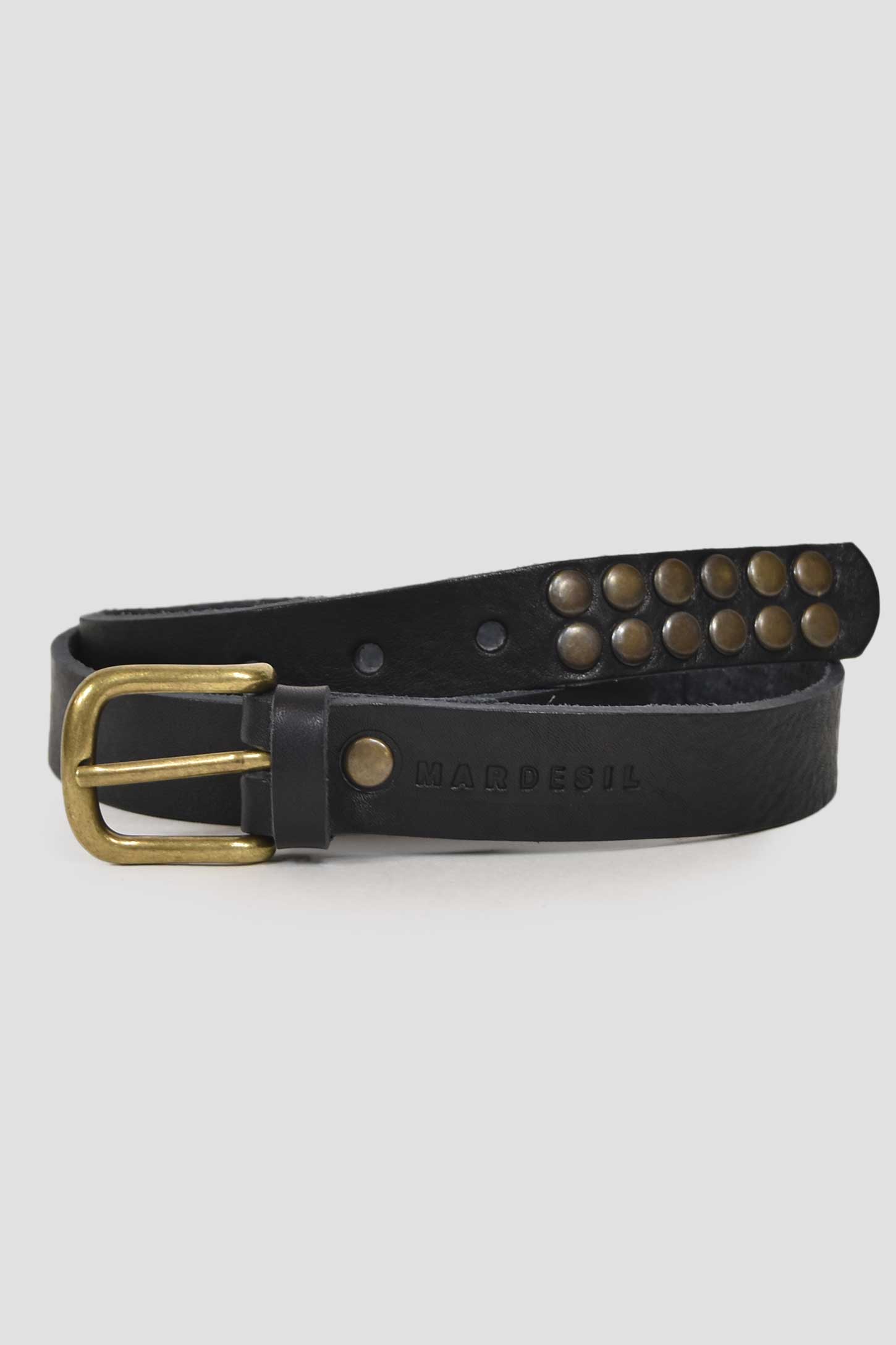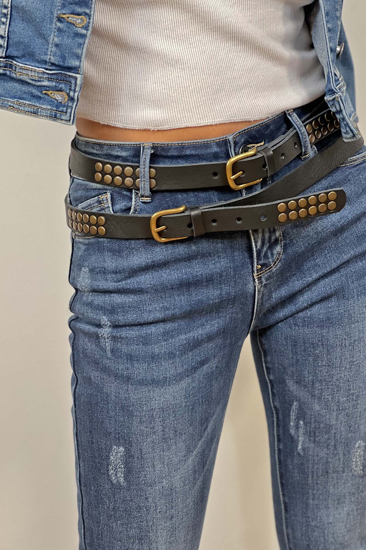 Cinturón de 2.5 cm de ancho confeccionado en piel. Hebilla metálica rectangular color oro viejo. Detalle aplicación de múltiples tachuelas.