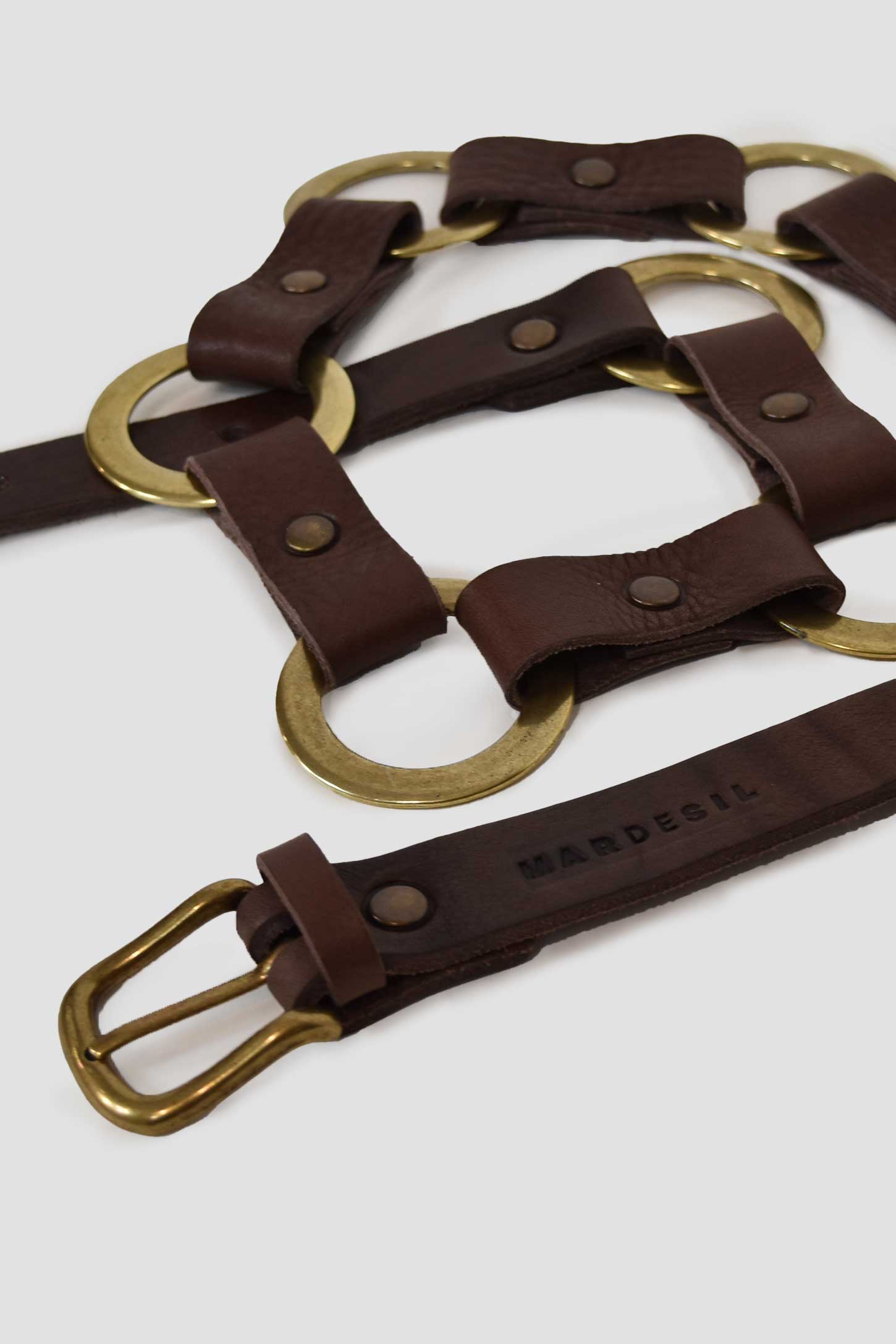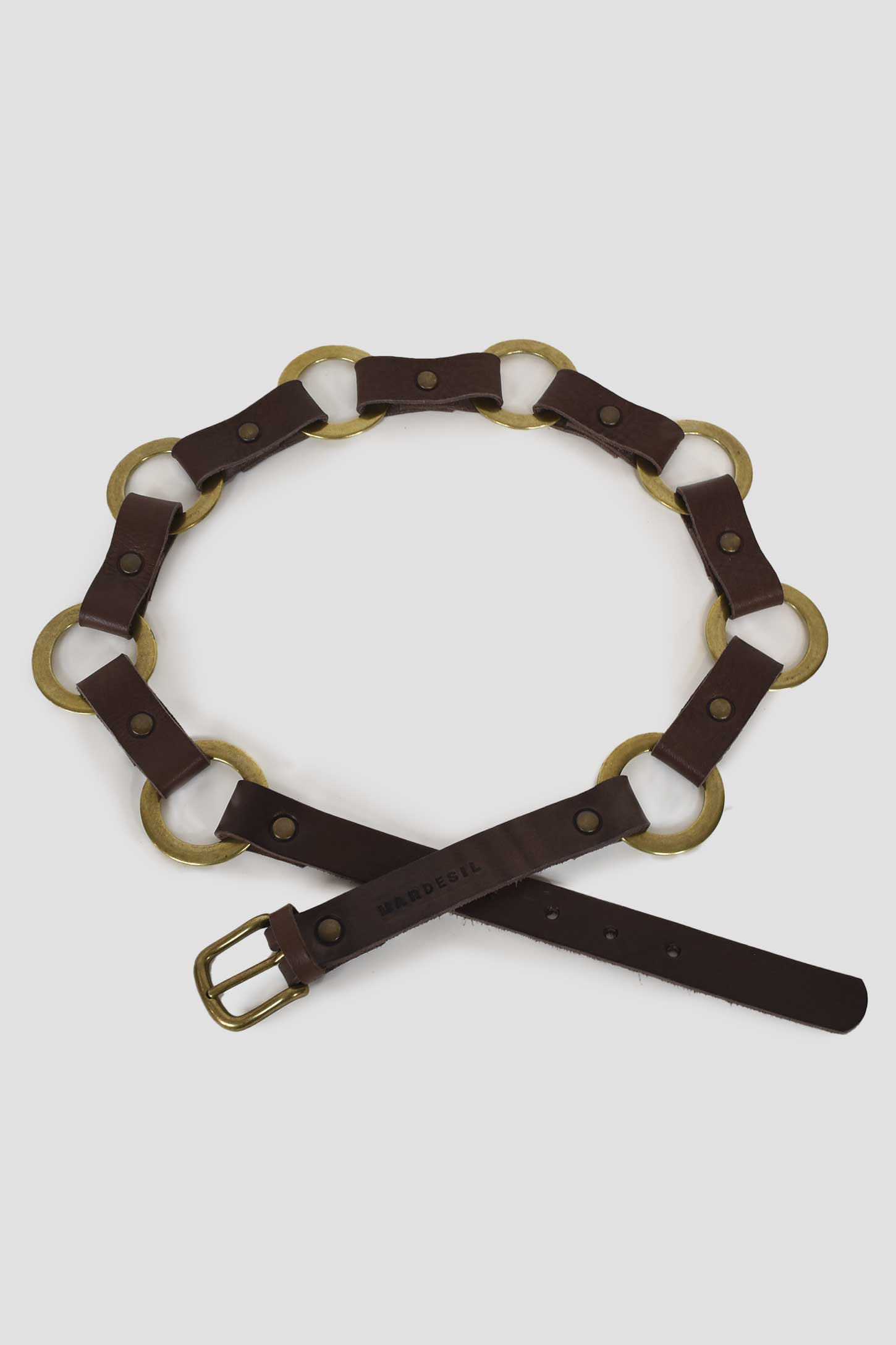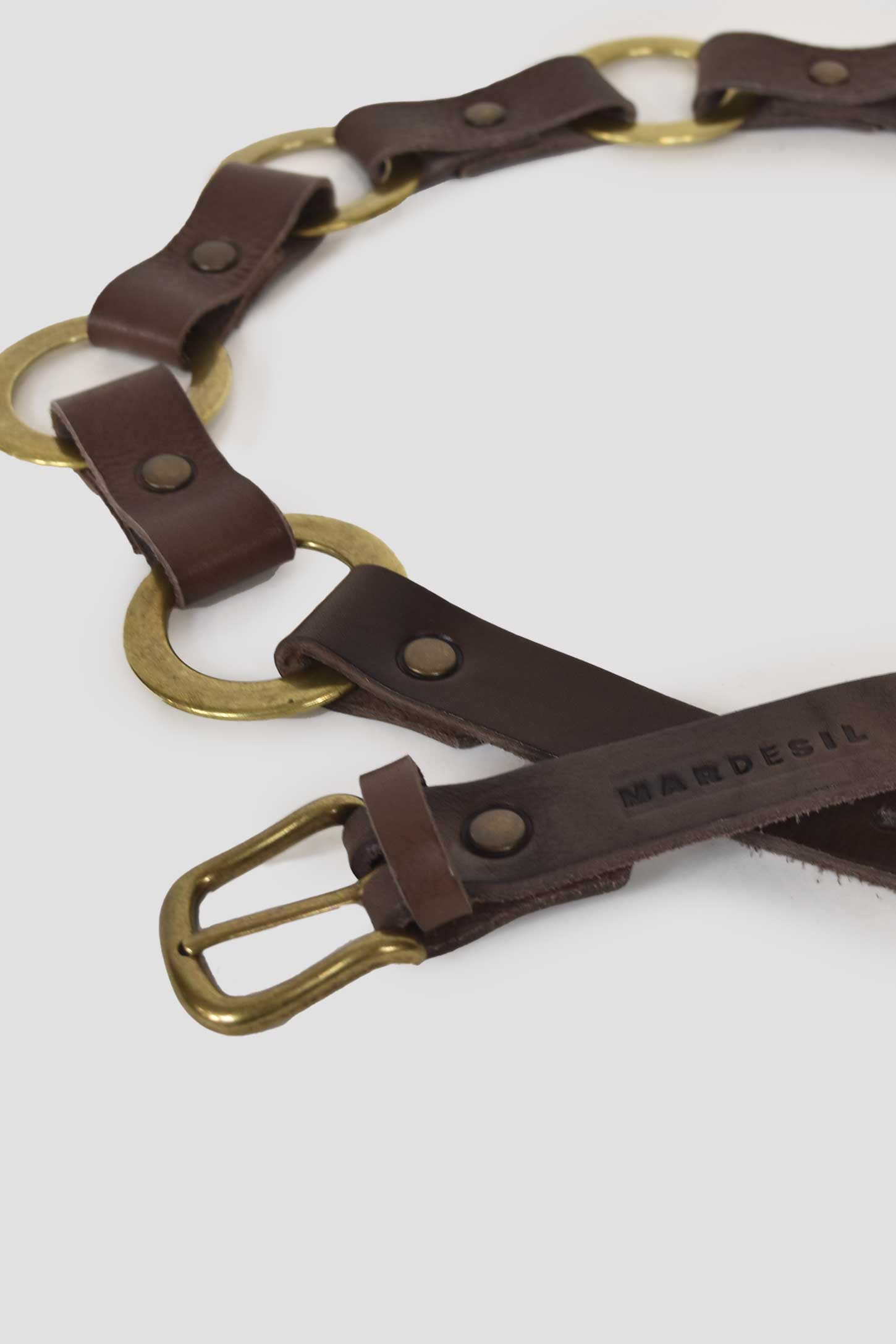 Cinturón confeccionado en piel. Color marrón chocolate. Hebilla metálica cuadrada en oro viejo.