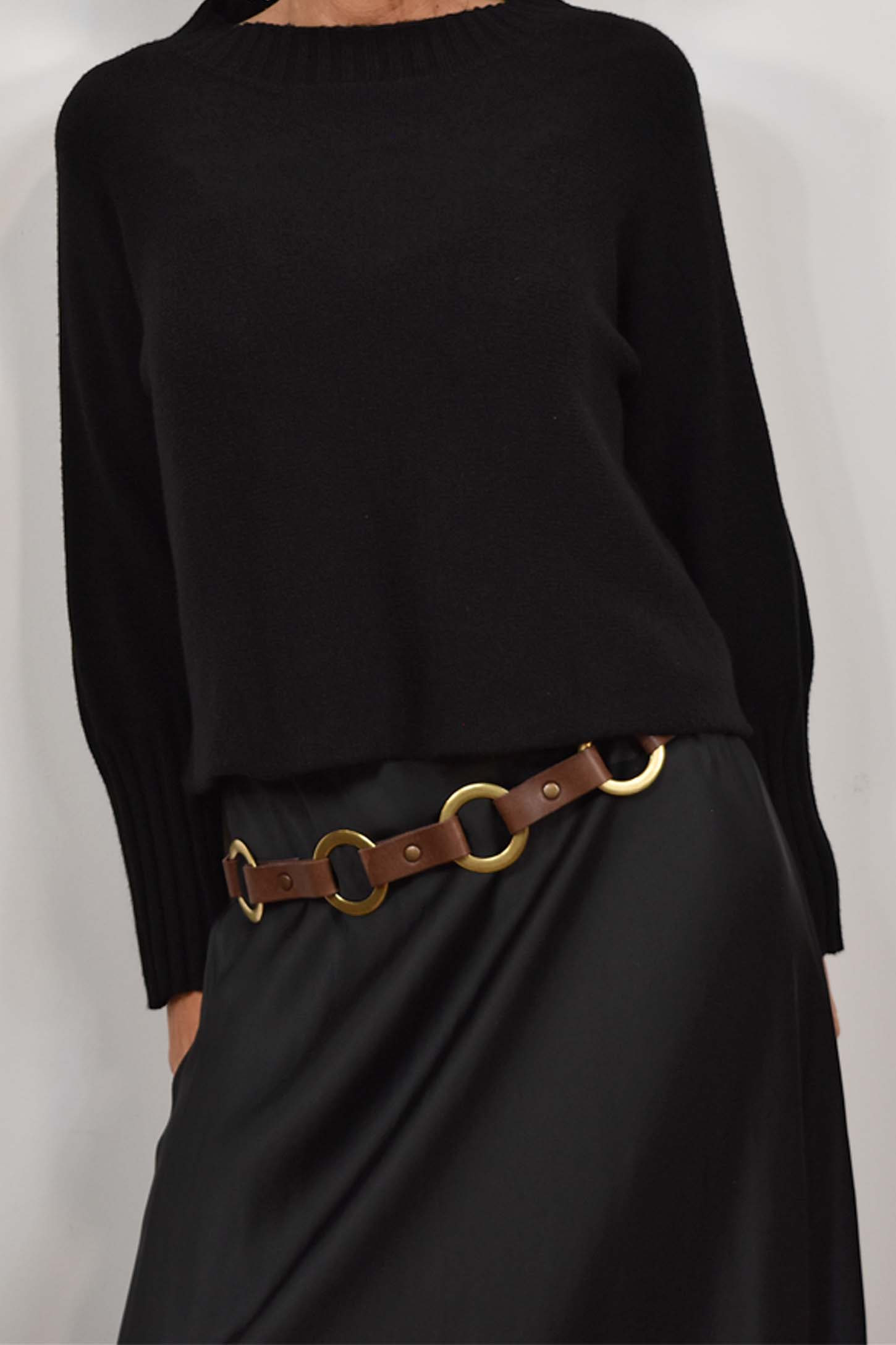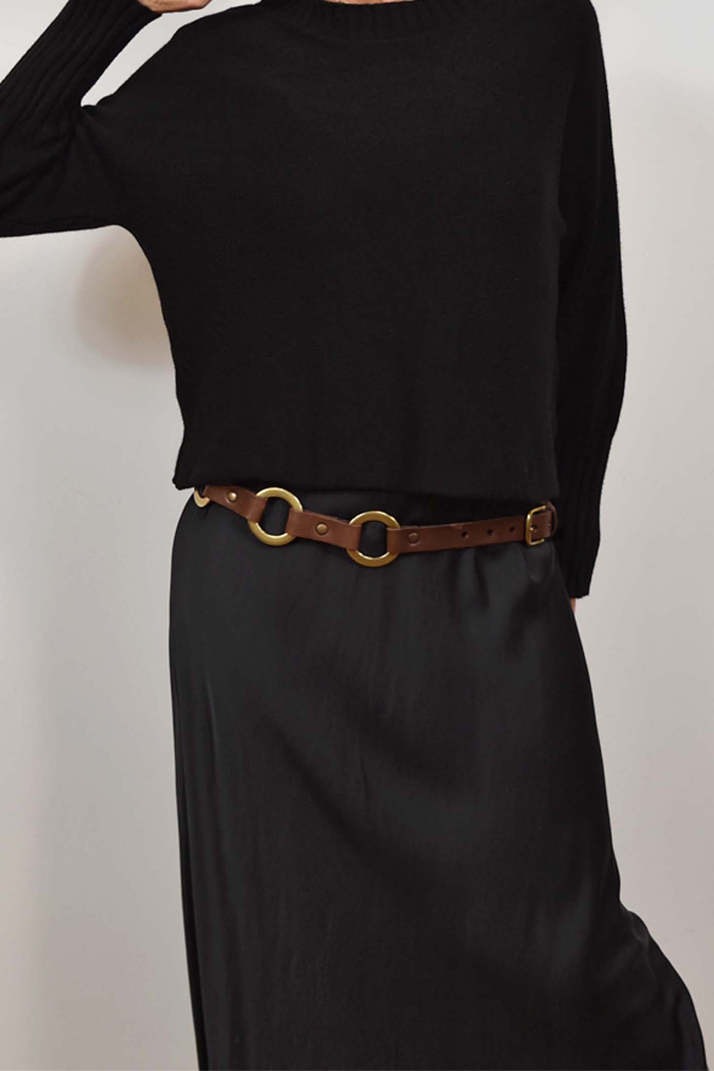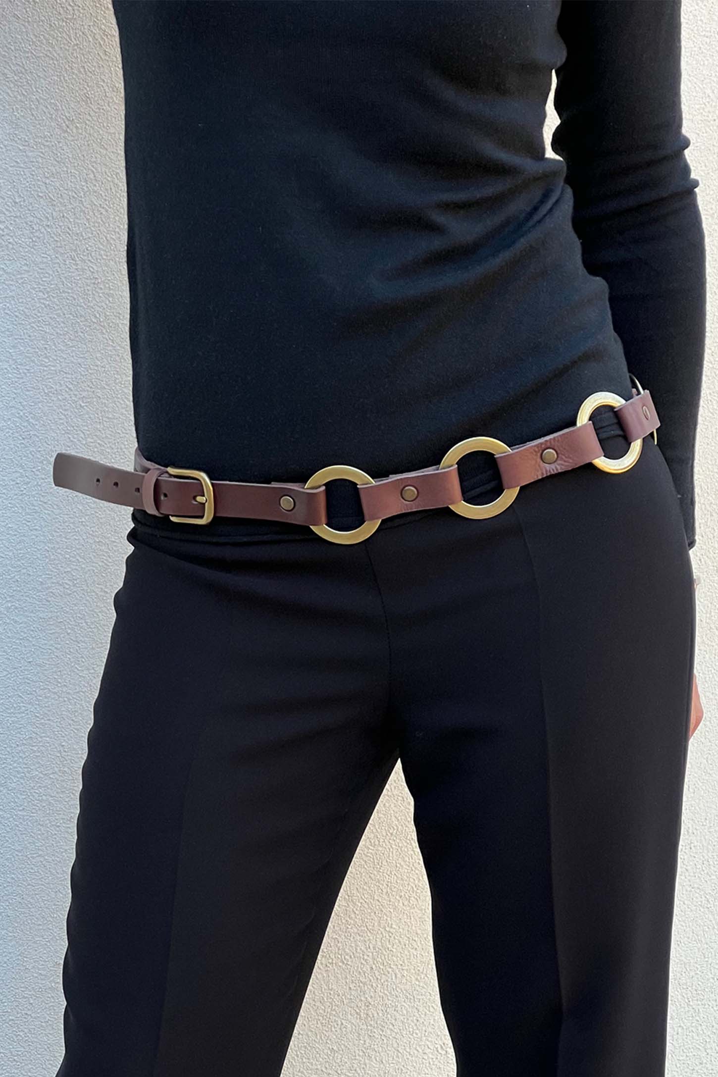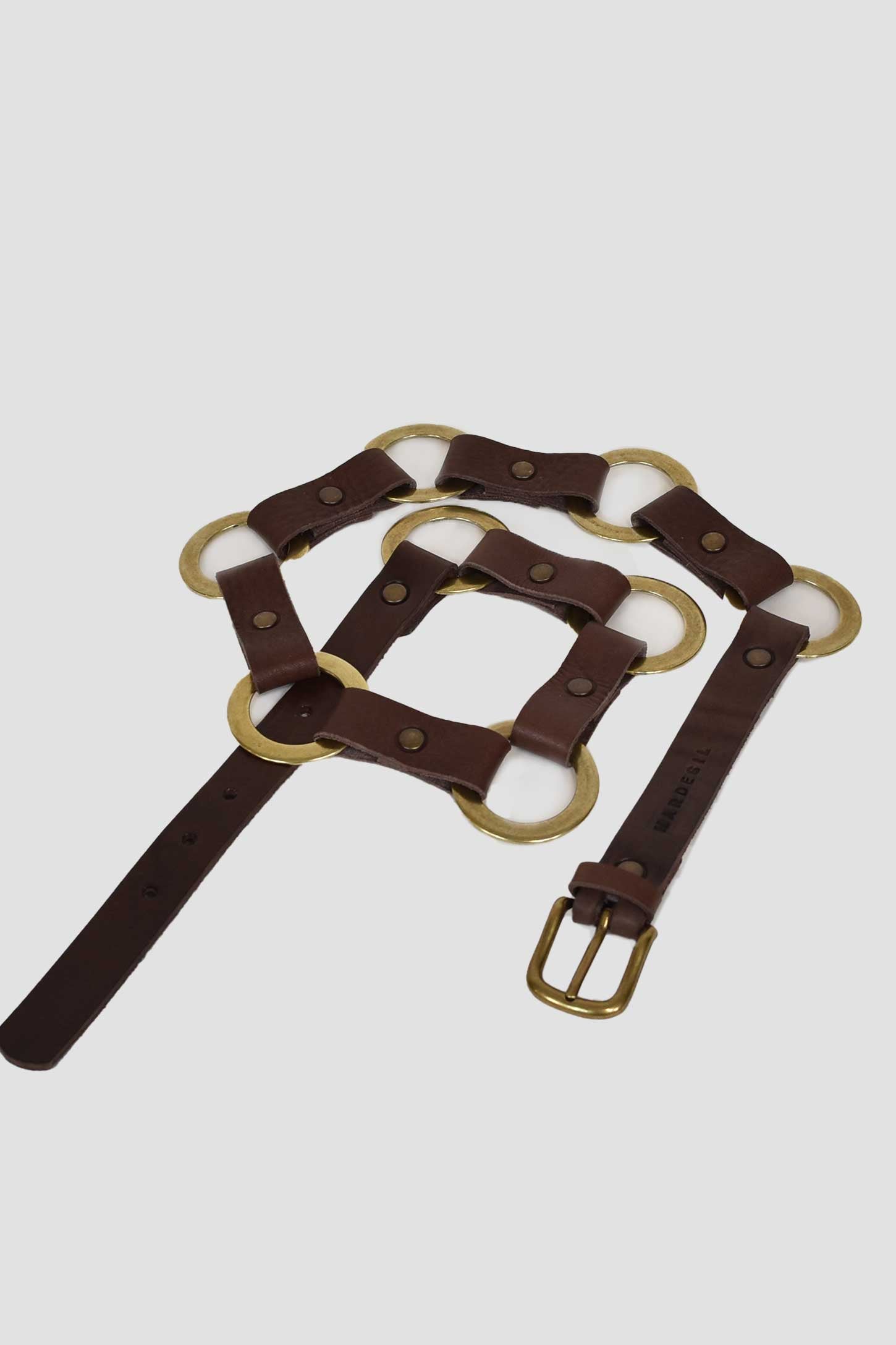 Cinturón confeccionado en piel. Color marrón chocolate. Hebilla metálica cuadrada en oro viejo.