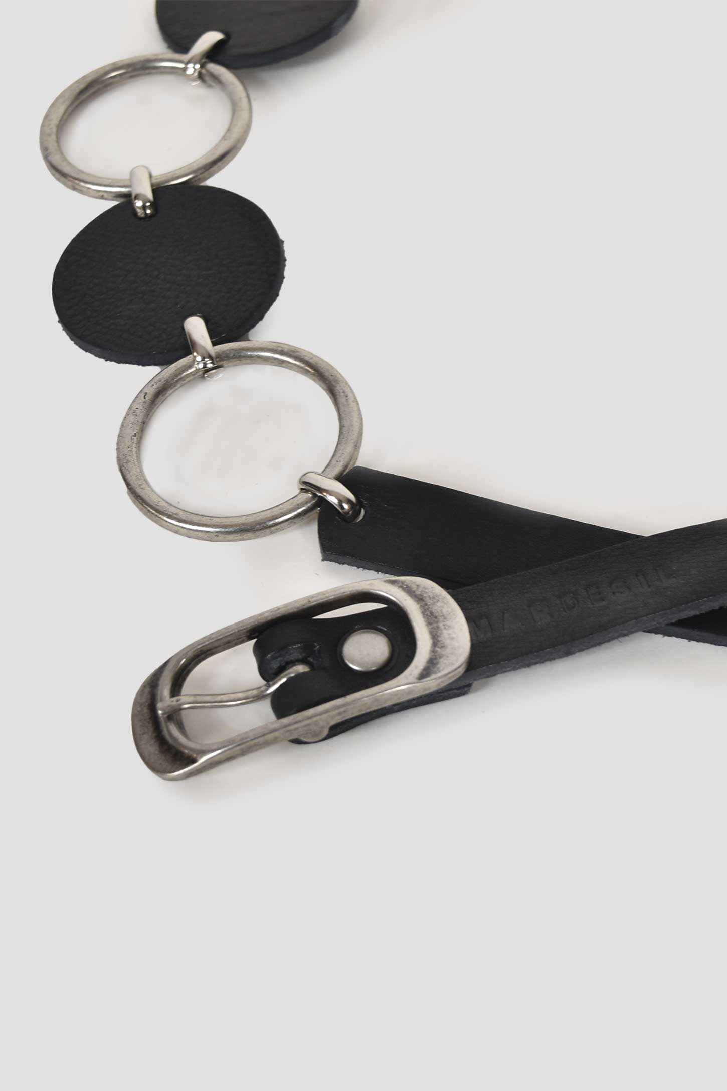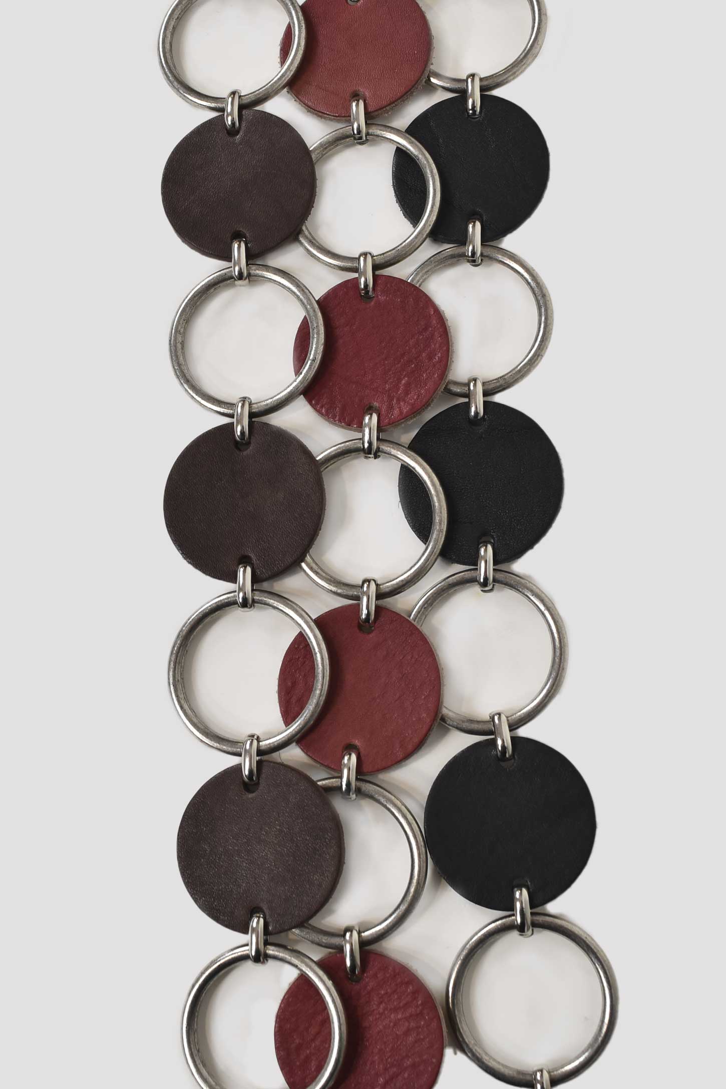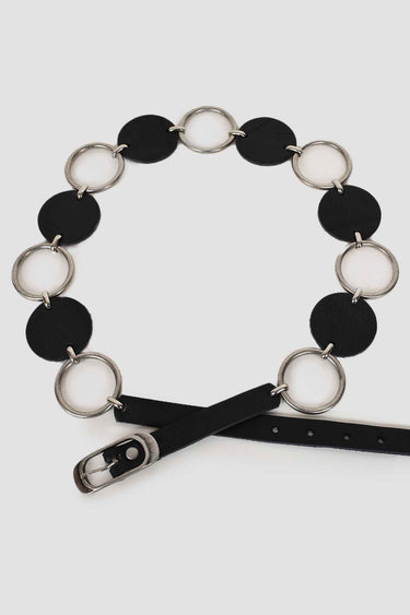 Cinturón confeccionado en piel. Hebilla metálica rectangular. Círculos confeccionados en piel alternados con aros plateados.